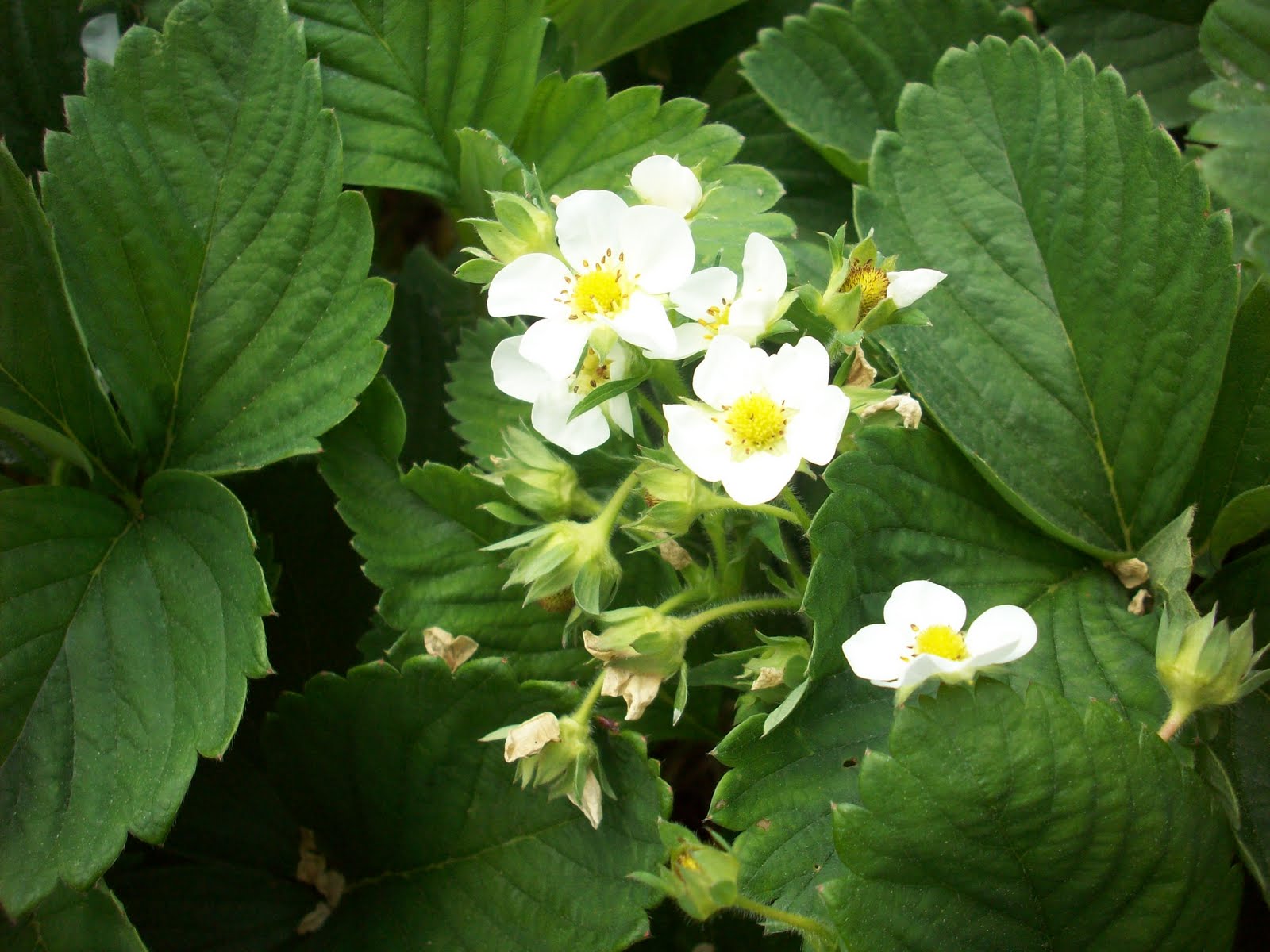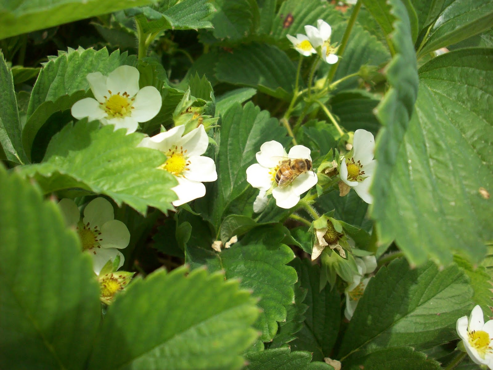 Walking through the strawberry patch this afternoon, I was sooooo happy to see some shining yellow-centered flowers…and some small green fruits! The plants were alive with buzzing bees and hopefully with a little rain this weekend, we will get a nice crop. Whew! much better than I expected!