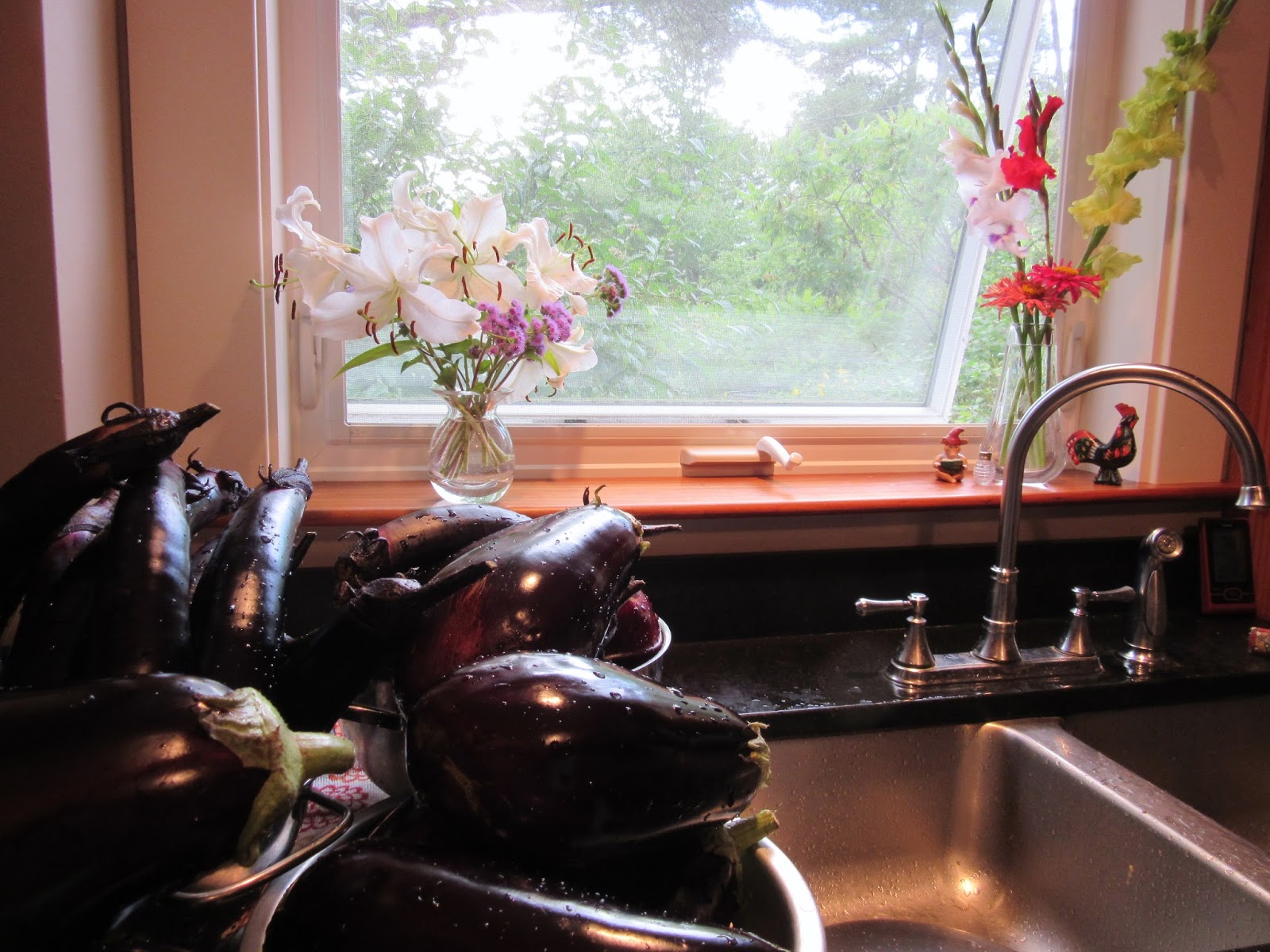 I hope your kitchens’ are as fragrant and beautiful as ours. Full of colorful veg and vibrant flowers, we are loving the bounty summer brings. I never really like eggplant before I started to grow it. Actually, I refused to grow it for my first several years at LRF, feeling that it was a tricky plant to grow in Maine’s short and somewhat cool summer. Plus, since it’s not a favorite to all, finding field space for it was never a priority. But a few shareholders, (uh-hmm, Mark and Anita) kept asking for it so I gave it a try. There must be something about this place, but from the get go, eggplants just seem to spew from my plants. And this year has been no exception (although, maybe I have just jinxed myself for 2016!). In fact, I have made a farm note to grow less next year, we just can’t eat it fast enough. Not only are the fruits gorgeous, but they are a fun sweet texture in the dishes we have been cooking lately. I think the fresh farm flavor converted me. So if you think you don’t like eggplant, or any vegetable for that matter, give it a 2nd chance at Little Ridge Farm, amazing new flavors might just surprise you.