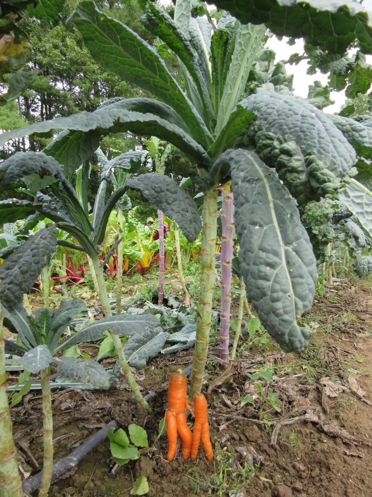 While we work so hard, sweating, harvesting, weeding, planting… the carrots just stroll around the farm, hand in hand under the shade of our tropical kale “trees”. Ah, what a life.