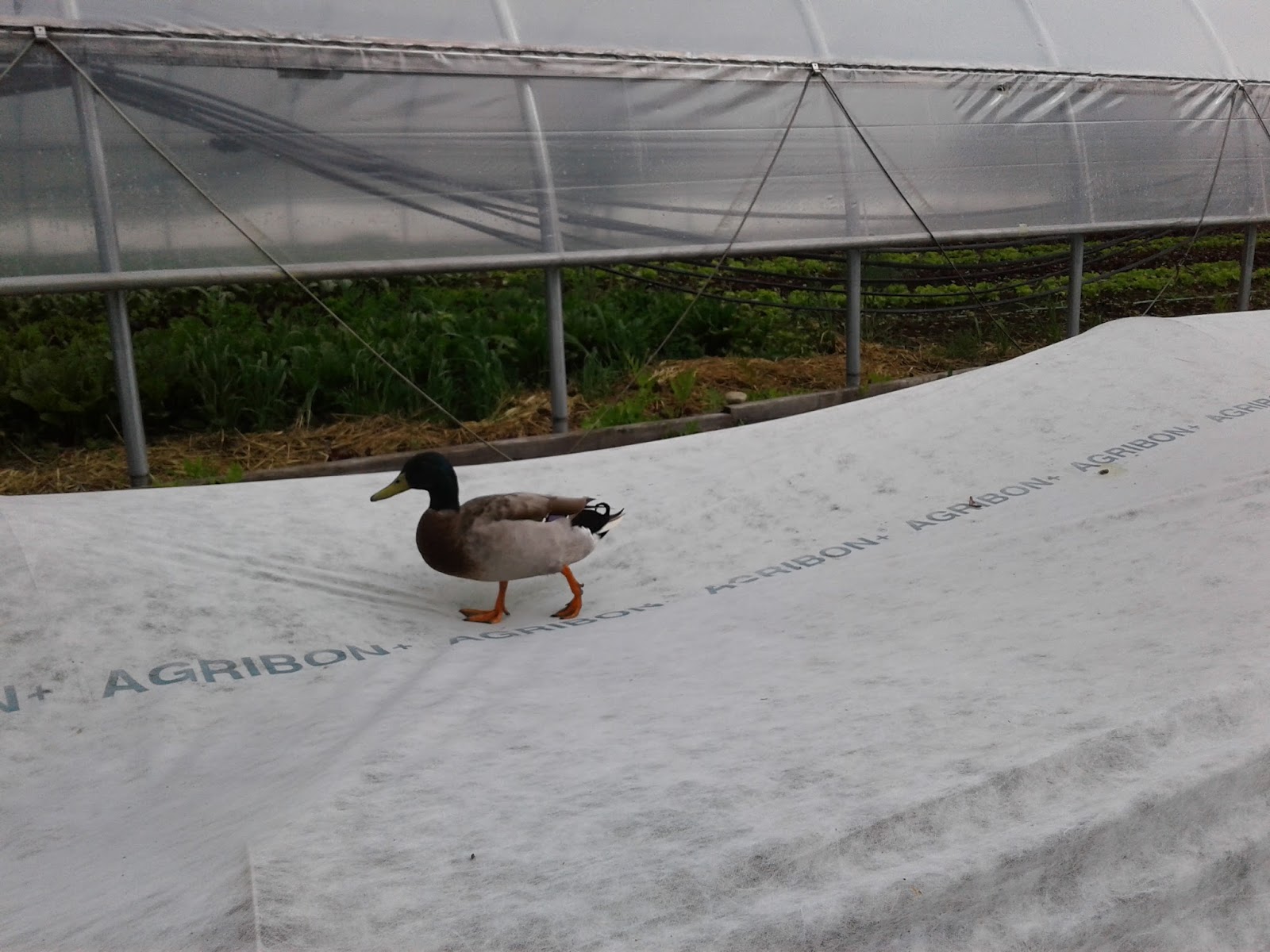 Typically in the spring we cover plants after we transplant them. Sometimes it’s to keep them warm and other times it’s to keep pesky bugs off of them. Chicken likes to use it as his treadmill.