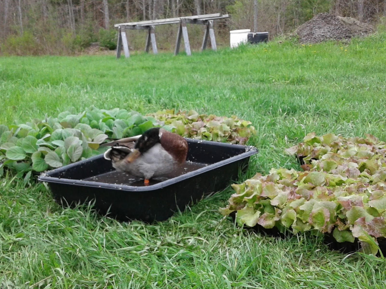 We spend much of our time transplanting May-June. Almost every minute actually, even though there are loads of other tasks to be done as well. Before we plant, we dunk each flat into a tank of “nutrient tea”. It’s a mix of worm castings, crab shell flour, humates and coral. It smells a bit like a fishy ocean, but the plants love it. Apparently so does Chicken.