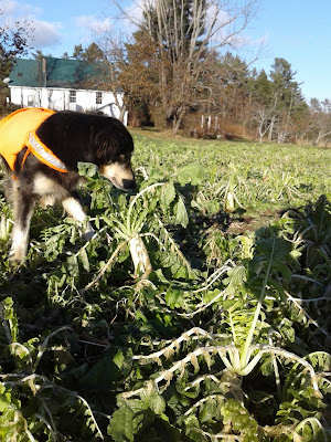 We get as many of the fields as we can covered in a green manure or cover crop before it gets too cold for seeds to germinate. The cover crops protect the soil from not only washing away but also keeps the soil structure intact (which keeps all the underground critters and microorganisms happy) and it holds as many nutrients in the field as possible until spring. Here is Simon, before the snow, checking out our Forage Radish cover. It is basically a daikon radish, which, if you have ever seen one, can be up near 18″ long! The root sinks itself into the soil, breaking up any compaction. Over winter the roots freeze, thaw and rot away leaving “pockets” where water and nutrients are kept safely until drier weather. In the spring, we will til this in, releasing the nutrients into the soil where newly transplanted strawberry plants will take them up into their roots. That is IF the spring cooperates and we can til and transplant on schedule!!!