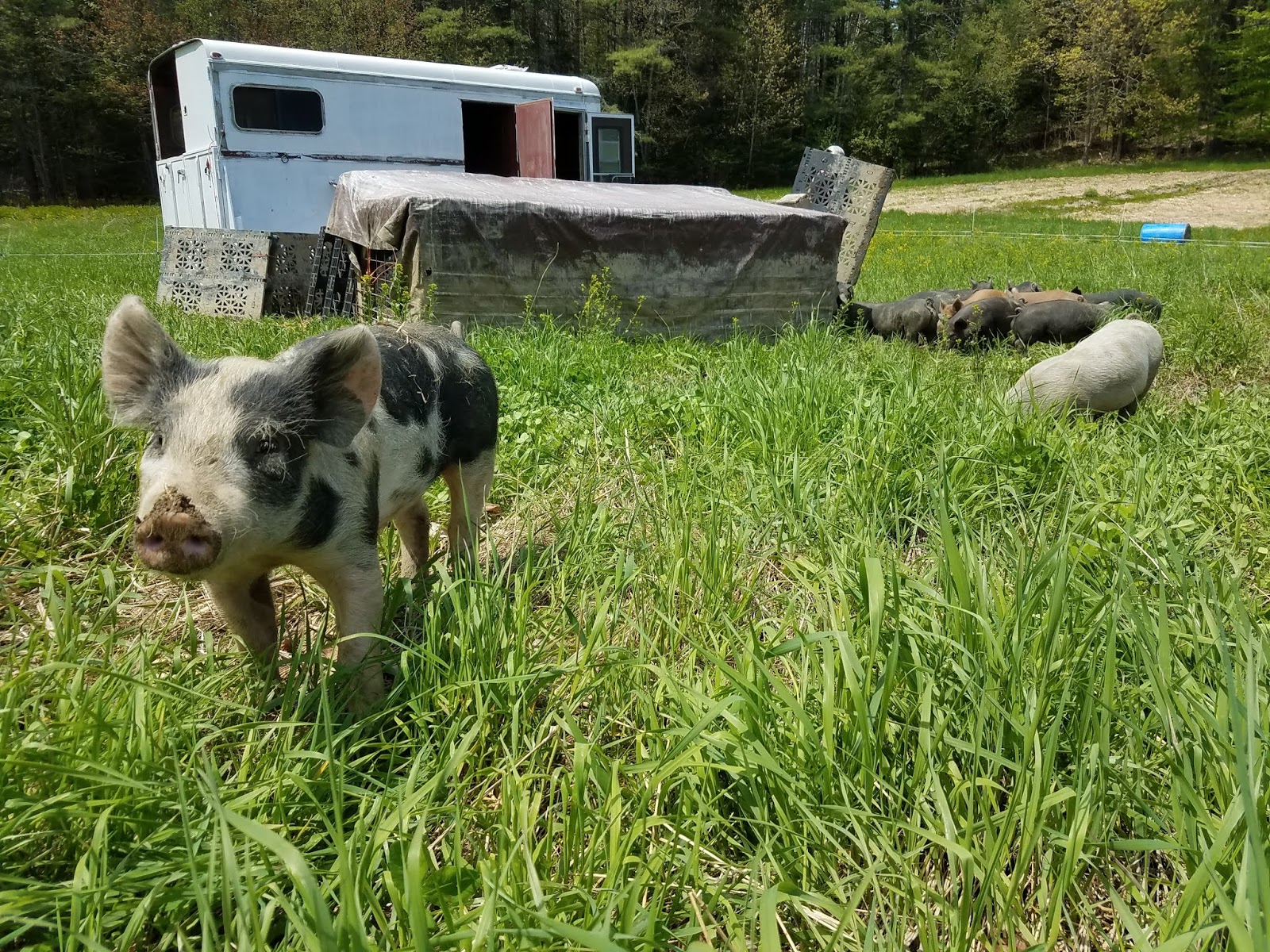 The pigs are out and about. A little skittish still but fence trained, seemingly well behaved and vigorous. Be sure to visit them!