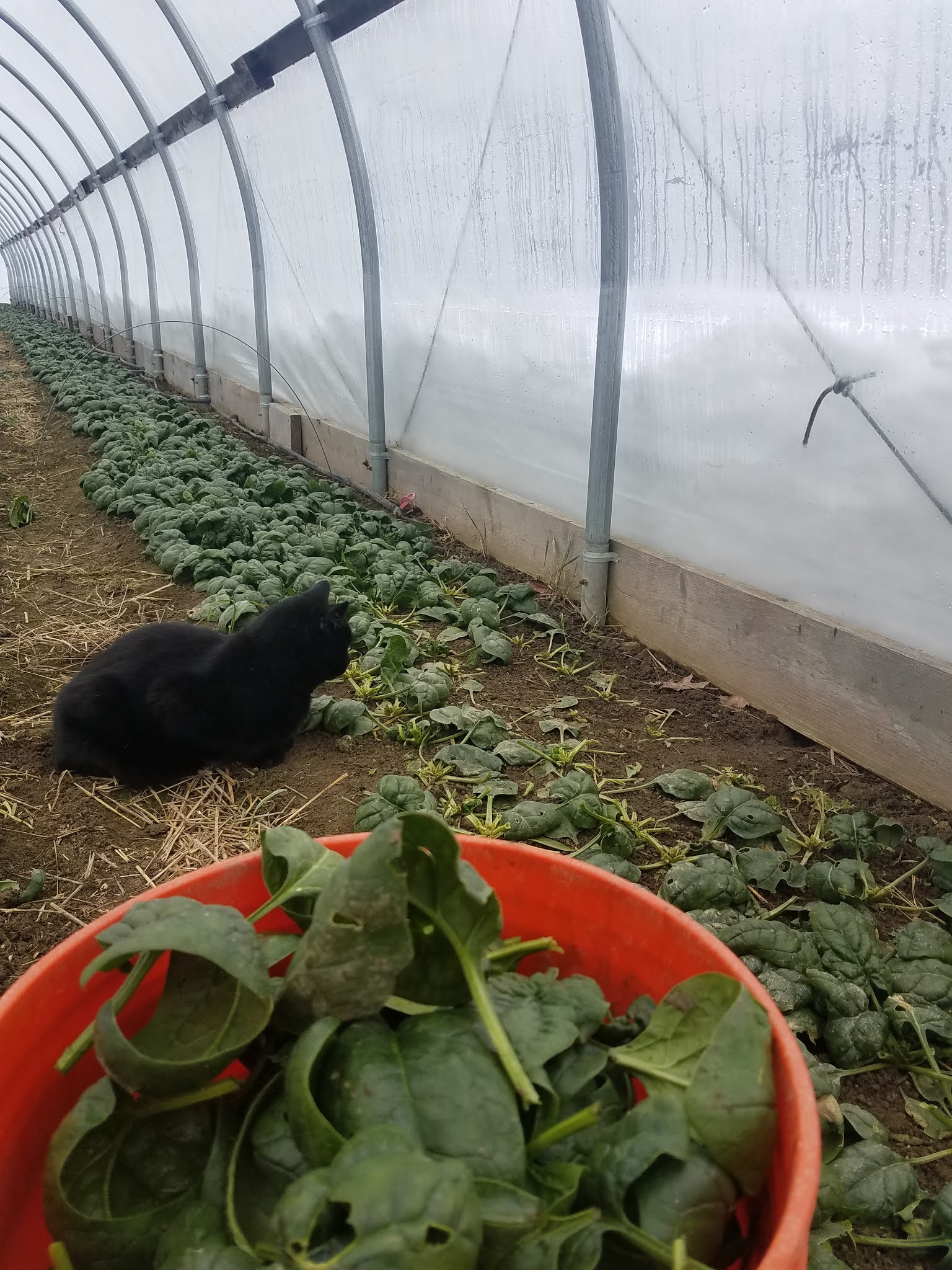 The warmer January weather allowed us to harvest spinach from the hoop house for our Winter Share this week. It is dark green, thick and juicy and tremendously sweet. It seems as though a mouse found it’s way into our sweetness and Puffa is patiently awaiting its return. He did bring me a “gift” later in the day, although I cannot be sure it was this spinach eating culprit. Hopefully, yes.