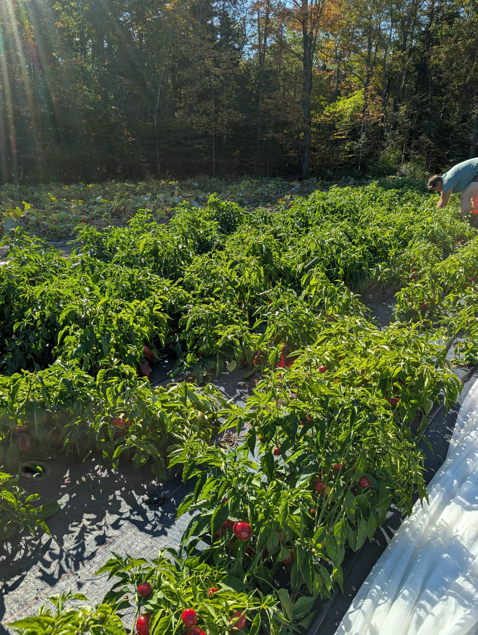 The bounty! If you pick up at the farm, you may have noticed tall stacks of crates in the barn. They are filled with peppers! So beautiful and sweet. We pulled as many as we could last week before a 25 degree night (this temp kills the leaves and stops growth). We have also invited the Androscoggin gleaners to come and pull more peppers off before another cold snap; donating their harvest to the local food banks. Our growing season is so short, literally 5 months that can grow crops like cucumbers, tomatoes and peppers. The CSA share has been heavy the last few weeks, we hope you are enjoying and taking advantage of the fresh; making pestos with extras, freezing tomatoes and peppers for winter stews and just simply savoring every bite. (We still have loads of tomatoes if you want to freeze some!!) I know it’s possible to buy anything you want at anytime at the grocery but eating seasonally and preserving seasonal foods are the best flavor, value and boost for your immune system — just a little plug for eating local : )
